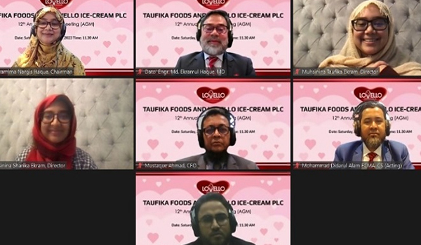 ৩০ ডিসেম্বর ২০২৩,শনিবার সকাল সাড়ে ১১টায় ডিজিটাল প্লাটফর্মের মাধ্যমে তাওফিকা ফুড্স এন্ড লাভেলো আইসক্রিম পিএলসির ১২তম এজিএম অনুষ্ঠিত হয়েছে।