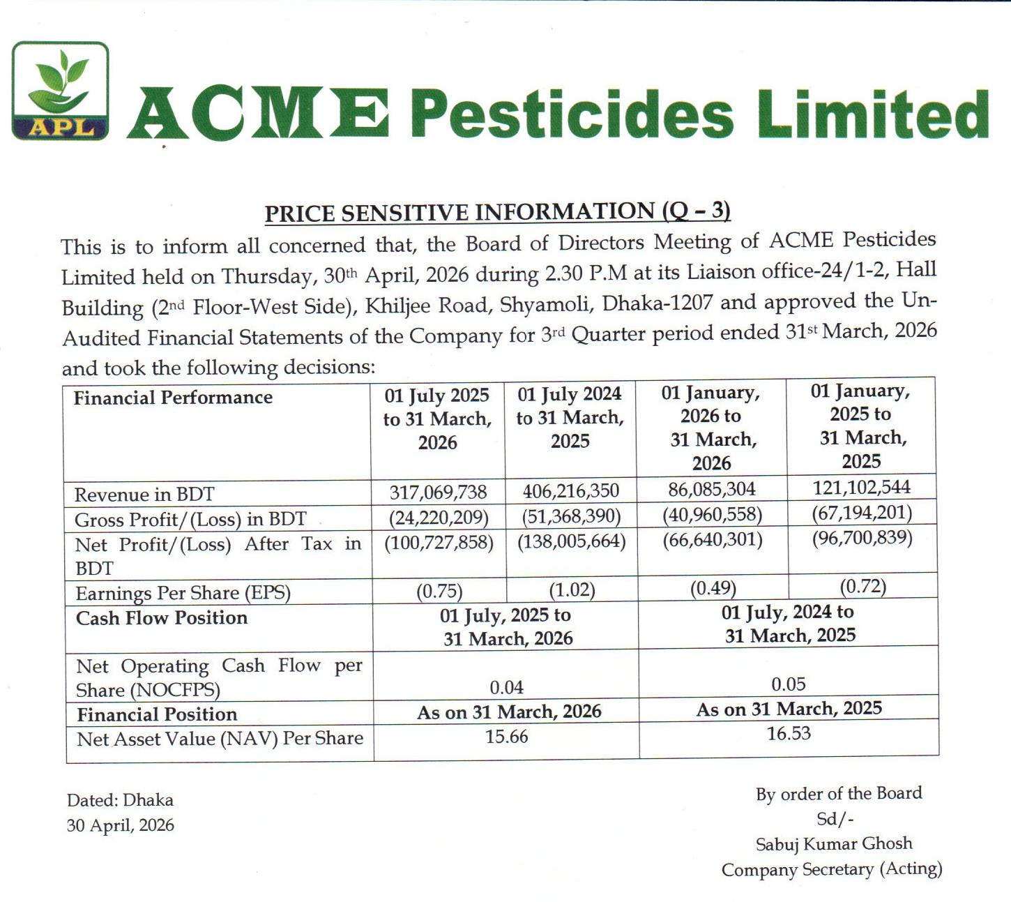 price sensitive information of acme pesticides সময়: বৃহস্পতিবার, এপ্রিল ৩০, ২০২৬ ৯:৪৪:১৪ অপরাহ্ণ Shares