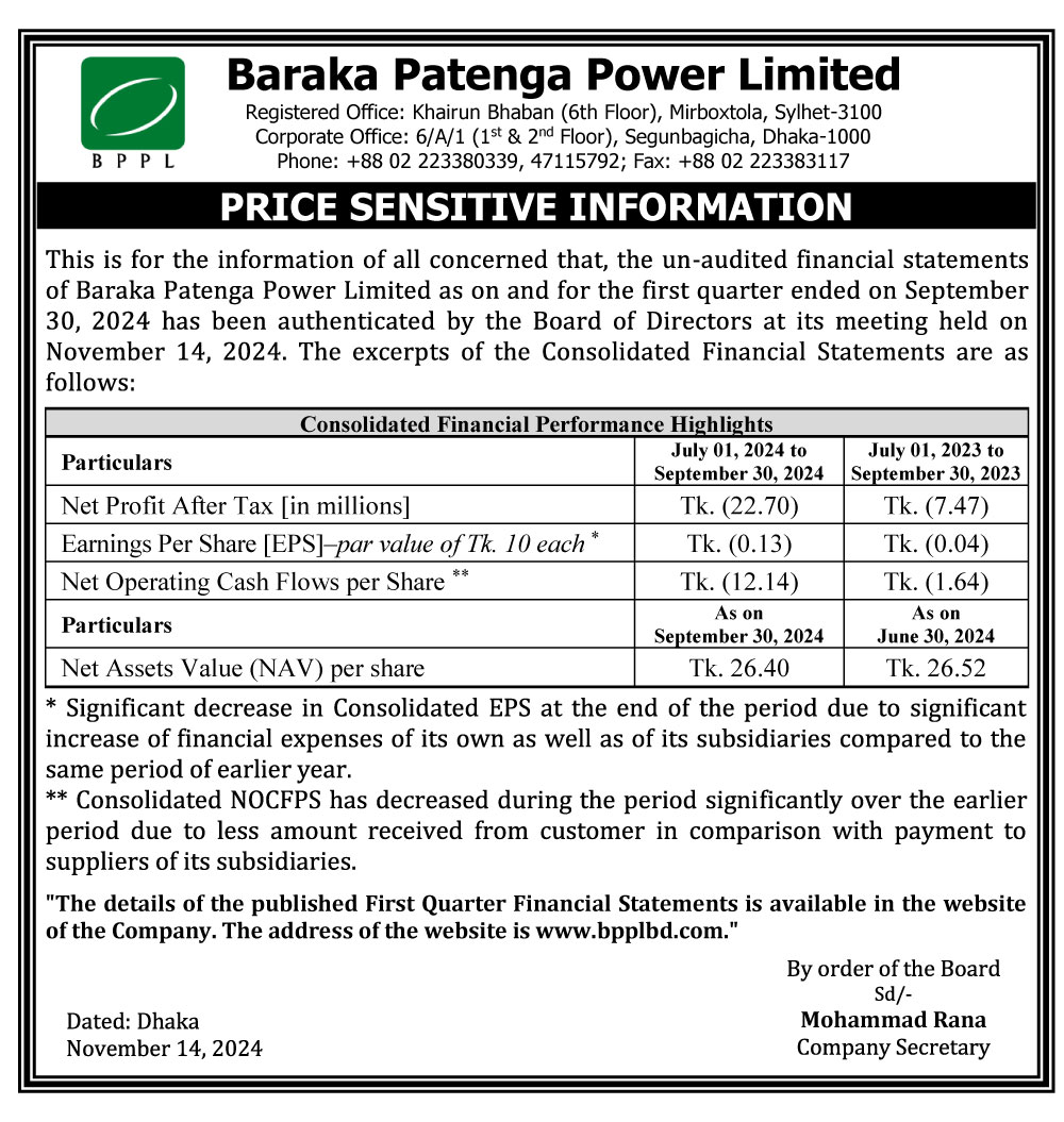 price sensitive information of baraka patenga power সময়: বৃহস্পতিবার, নভেম্বর ১৪, ২০২৪ ৭:৫৫:৪৮ অপরাহ্ণ Shares