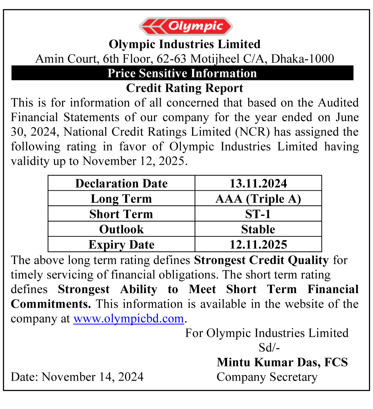 price sensitive information of olympic industries সময়: বৃহস্পতিবার, নভেম্বর ১৪, ২০২৪ ২:০৫:৪৪ অপরাহ্ণ Shares