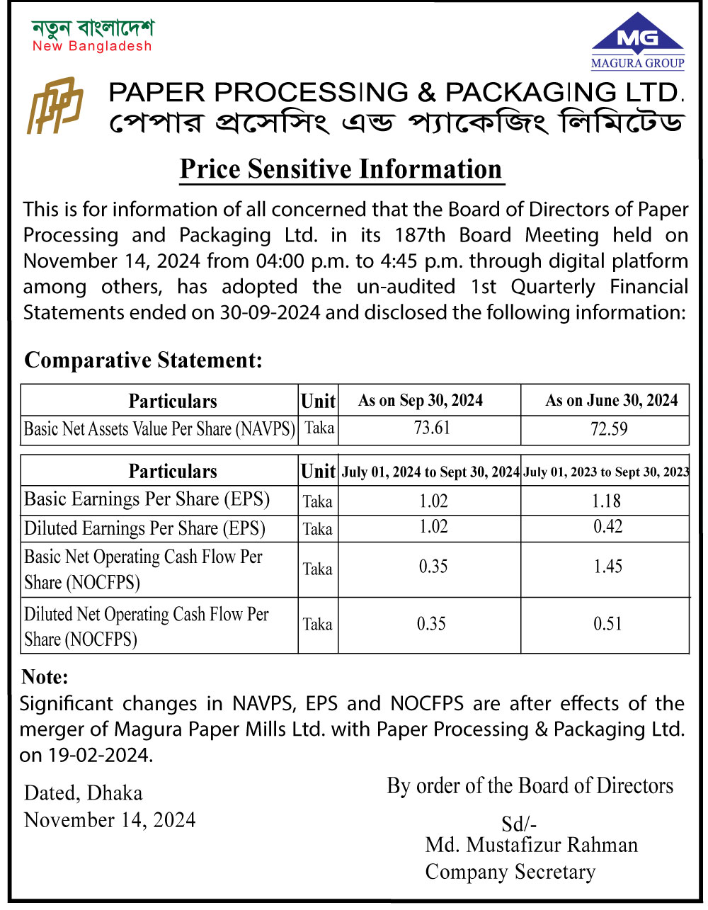 price sensitive information of paper processing সময়: বৃহস্পতিবার, নভেম্বর ১৪, ২০২৪ ৫:৪৯:৫২ অপরাহ্ণ Shares